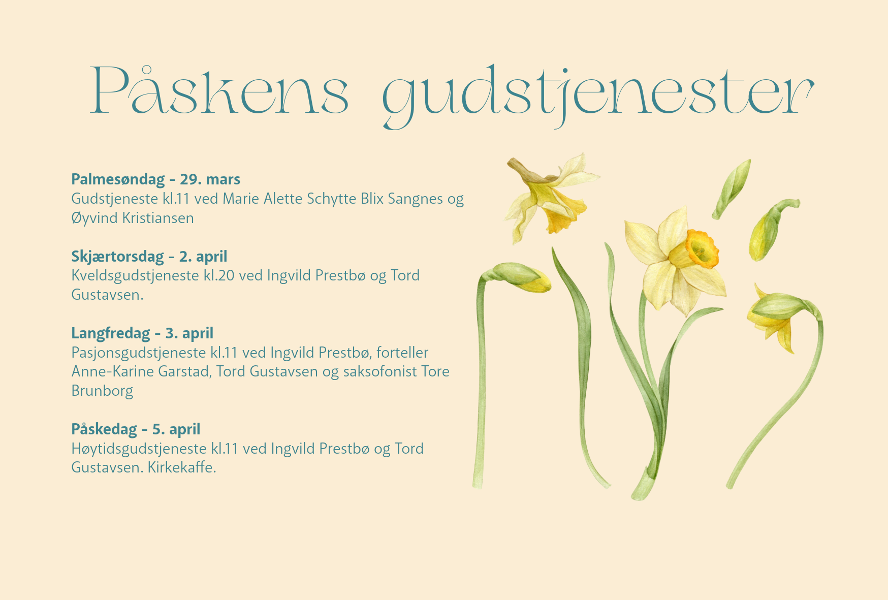 Søndag 12. april kl. 18.00 fremfører Tanum barnekor med flere barnemusikalen «Maria og blomstene». Musikalen består av 12 sanger, akkompagnert av kantor Tord Gustavsen. Musikalen er skrevet av Åshild Watne, musikk og Elisabeth Aanje, tekst.