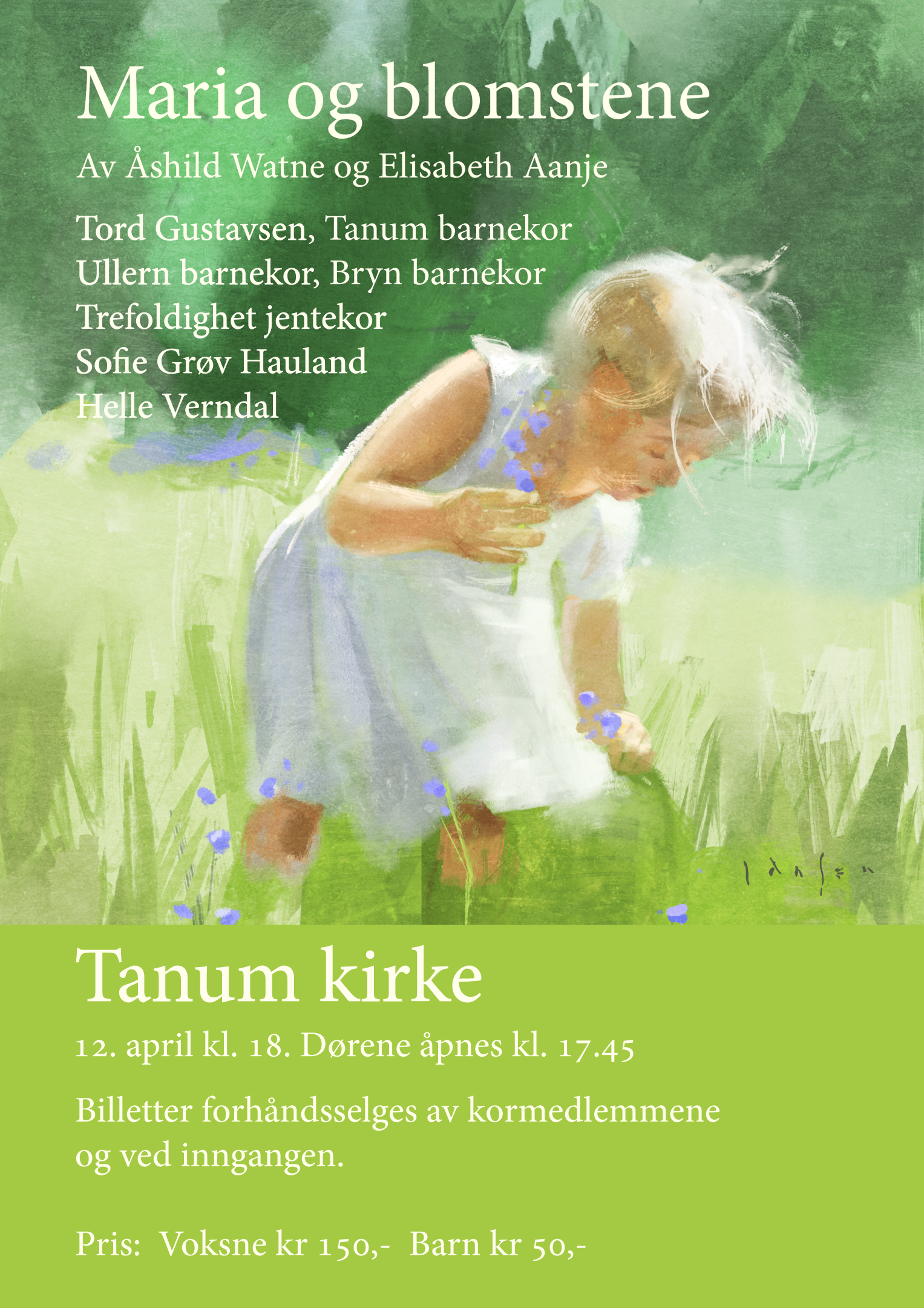 Søndag 12. april kl. 18.00 fremfører Tanum barnekor med flere barnemusikalen «Maria og blomstene». Musikalen består av 12 sanger, akkompagnert av kantor Tord Gustavsen. Musikalen er skrevet av Åshild Watne, musikk og Elisabeth Aanje, tekst.